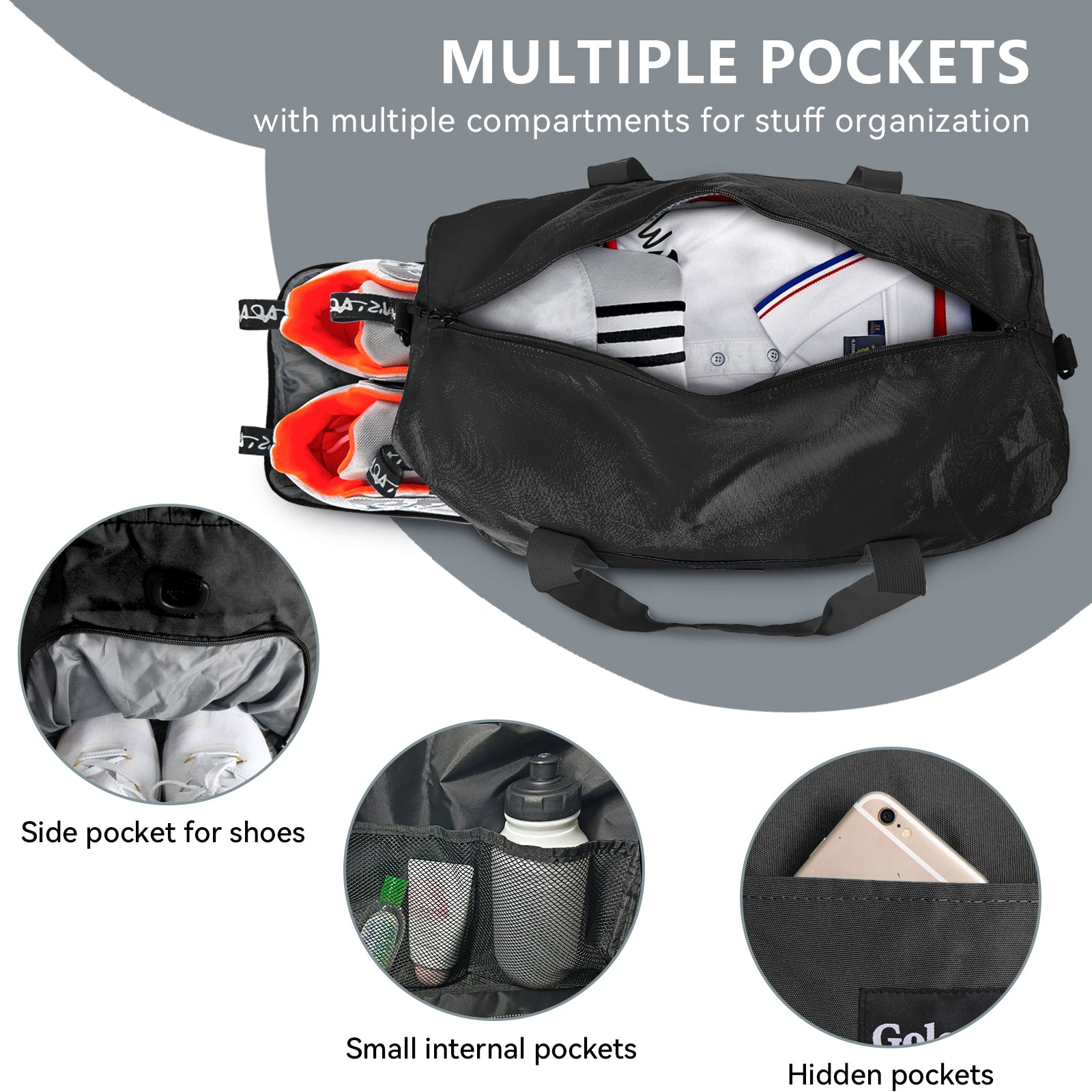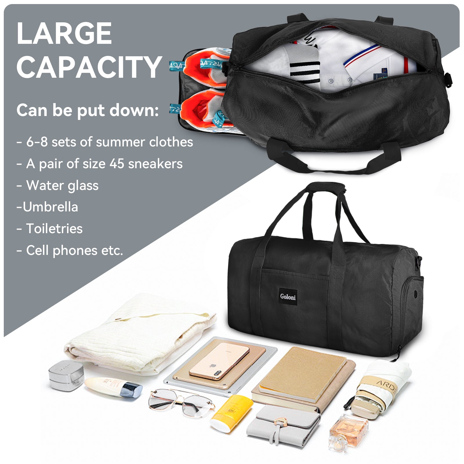 - Large capacity and mutiple pockets allow you to put all your personal item for travel, for gym workout. Duffel bag with shoe comparment, side one mesh pocket and one zipper pocket, front zipper pocket, inside three mesh pockets, inside one PVC zipper pocket for wet items.Duffel bags for traveling women can organize your items well.