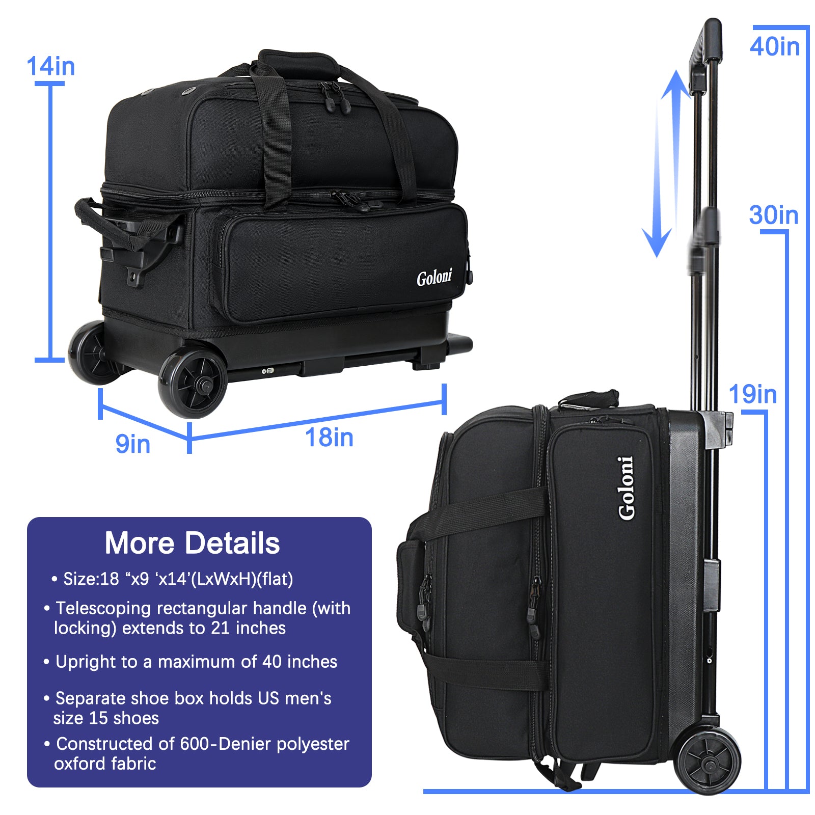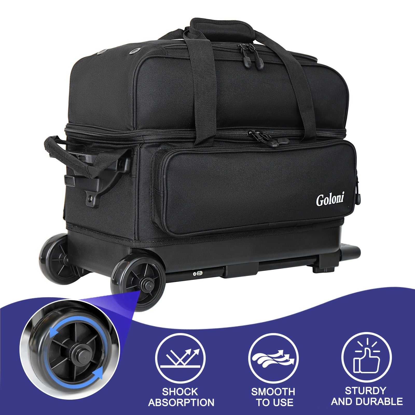 Goloni Double Roller 2 Ball Bowling Bag with Separate Shoe Compartment,2 Ball Bowling Bag with Wheels,Retractable Handle Extends to 40"
